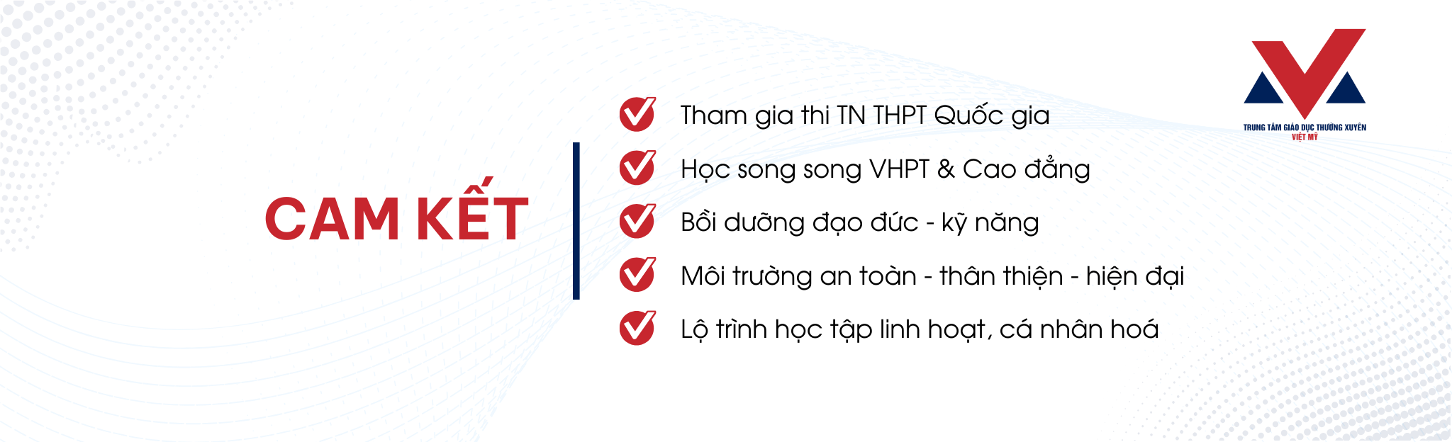 Trung tâm Giáo dục thường xuyên Việt Mỹ đào tạo chương trình Văn hoá phổ thông 7 môn (Toán, Ngữ văn, Lịch sử, Sinh học, Vật lí, Địa lí, GDKTPL [Giáo dục Kinh tế Pháp luật]) theo định hướng tối ưu, tập trung vào các môn học cần thiết phục vụ mục tiêu Tốt nghiệp THPT và xét tuyển Cao đẳng, Đại học, giảm áp lực học tập.