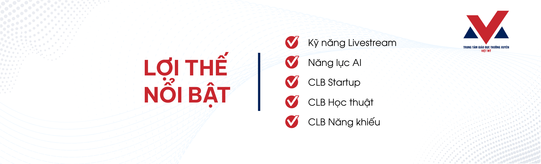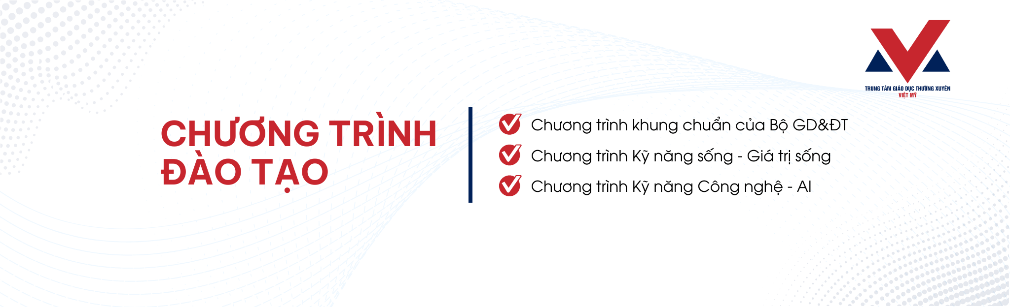 Ngoài kiến thức chung theo khung chương trình của Bộ GD&ĐT, học viên TT. GDTX Việt Mỹ còn được trau dồi các nội dung về kỹ năng,… đặc biệt là những nội dung công nghệ số như: Livestream, AI,… các hoạt động Startup và nhiều Câu lạc bộ về Học thuật, Năng khiếu,… để học viên sinh hoạt và rèn giũa.