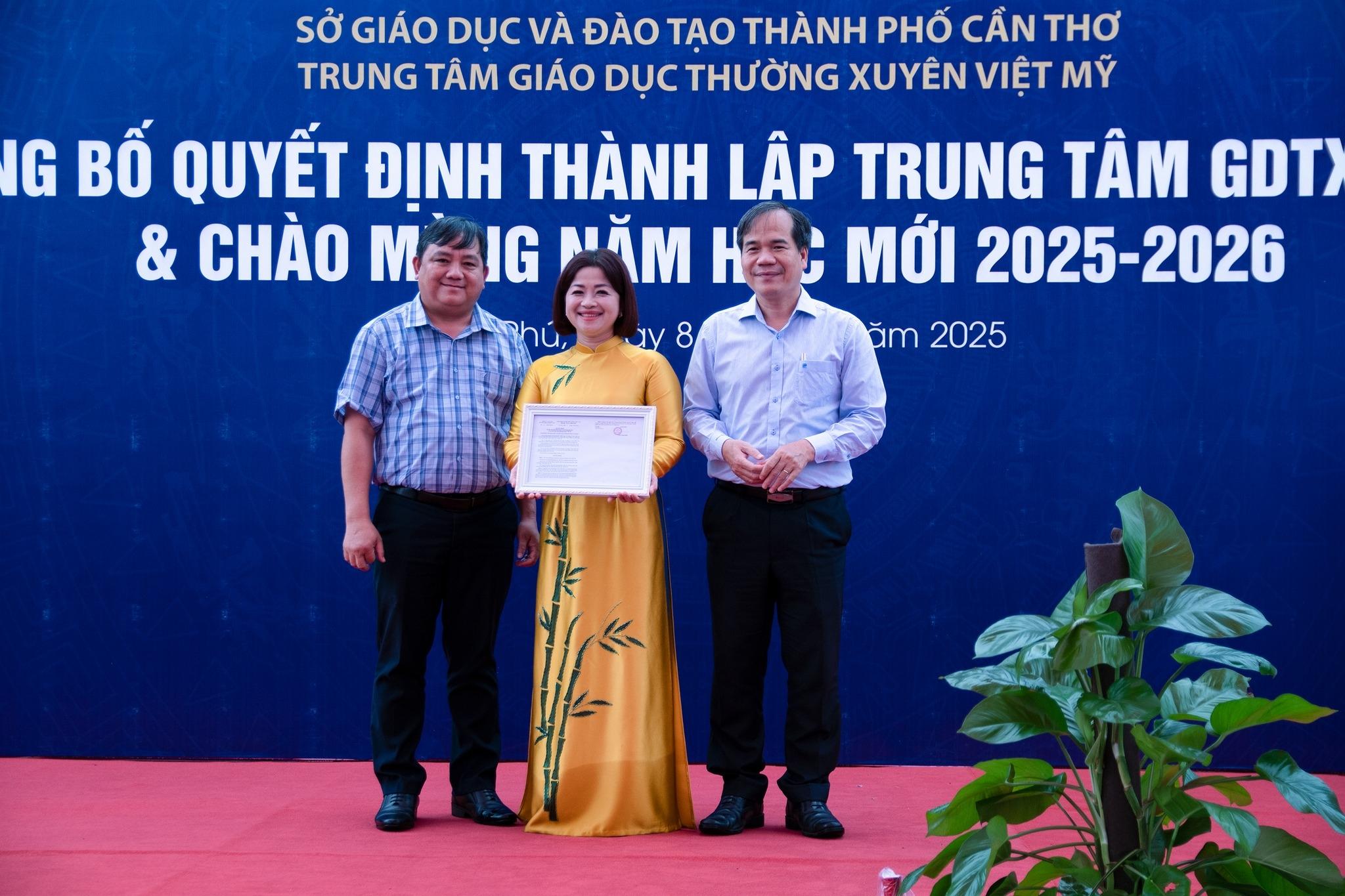 Giám đốc Trung tâm GDTX Việt Mỹ – Bà Ung Thị Trang nhận Quyết định thành lập, hoạt động từ Đại diện Lãnh đạo Sở GD&ĐT Cần Thơ